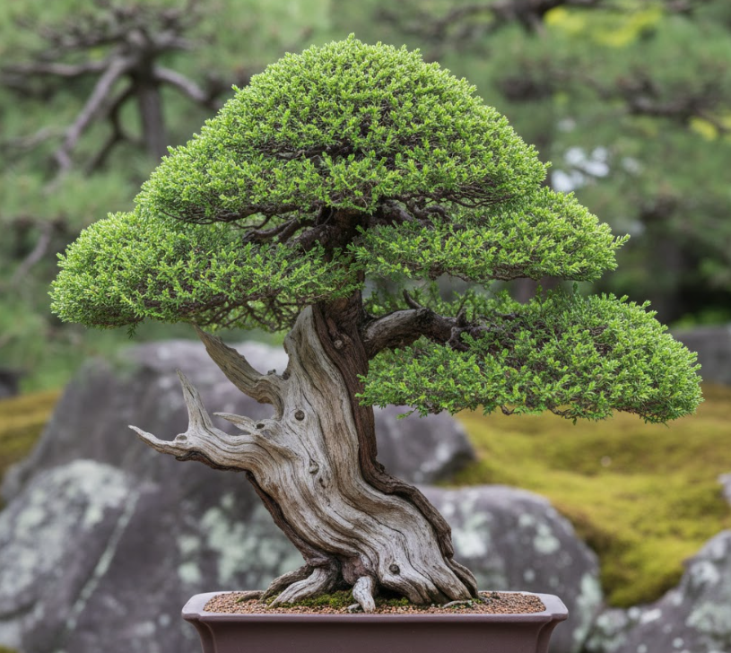 造形美を楽しむ:松以外の針葉樹 真柏寄せ植えの杉盆栽 2026.01.222026.01.24 ※本記事はプロモーションが含まれています 松以外にも、盆栽には魅力的な針葉樹がたくさんあります。 特に、白い骨のような枝(ジン・シャリ)を見せる「真柏」や、鋭い葉を持つ「杜松」などは、松とはまた違った芸術的な姿で、多くの愛好家を魅了しています。 真柏 画像を押すと真柏のページに 盆栽界のもう一つの主役。幹や枝の一部が枯れて白くなった「神(ジン)」や「舎利(シャリ)」と、緑の葉のコントラストが最大の見どころです。 杜松 荒々しい幹の杜松盆栽 「ネズミサシ」とも呼ばれるほど鋭い葉が特徴。その野性味あふれる姿は、厳しい自然環境を連想させます。水を好むため、水切れには注意が必要です。 杉・檜 直幹の津山檜 日本の森を象徴する木々。幹が天に向かって真っ直ぐ伸びる「直幹(ちょっかん)」作りや、複数の木を寄せて森のような景色を作る「寄せ植え」が人気です。