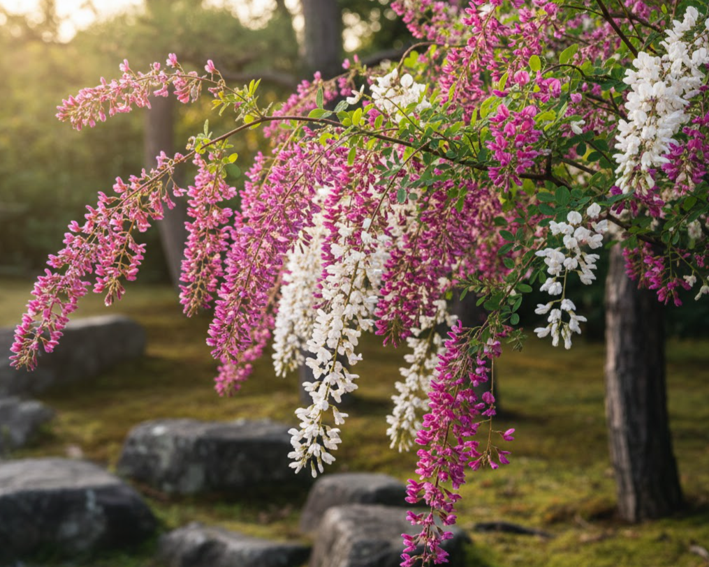 - 萩(ハギ) 「秋の七草」の一つ。しなやかに垂れた枝先に、赤紫や白の小さな花を咲かせます。風に揺れる姿は日本の秋そのものです。
