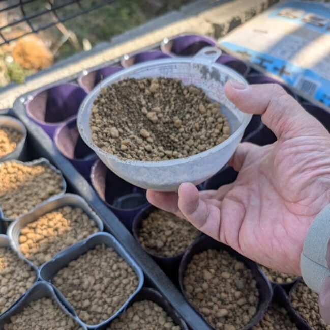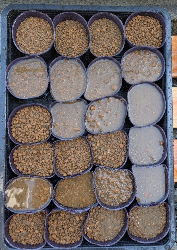 小サイズのポット57個と大サイズのポット6個に土入れが完成しました。大サイズのポットの土が少し違うのですが、これは【焼き赤玉土の極小】を入れています。普通の赤玉土の3~4倍ぐらいの価格がしました。
